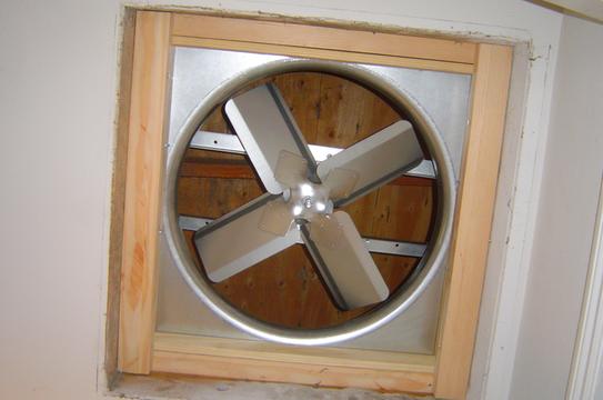 An attic fan draws hot air out of the top of a home and vents it outside.