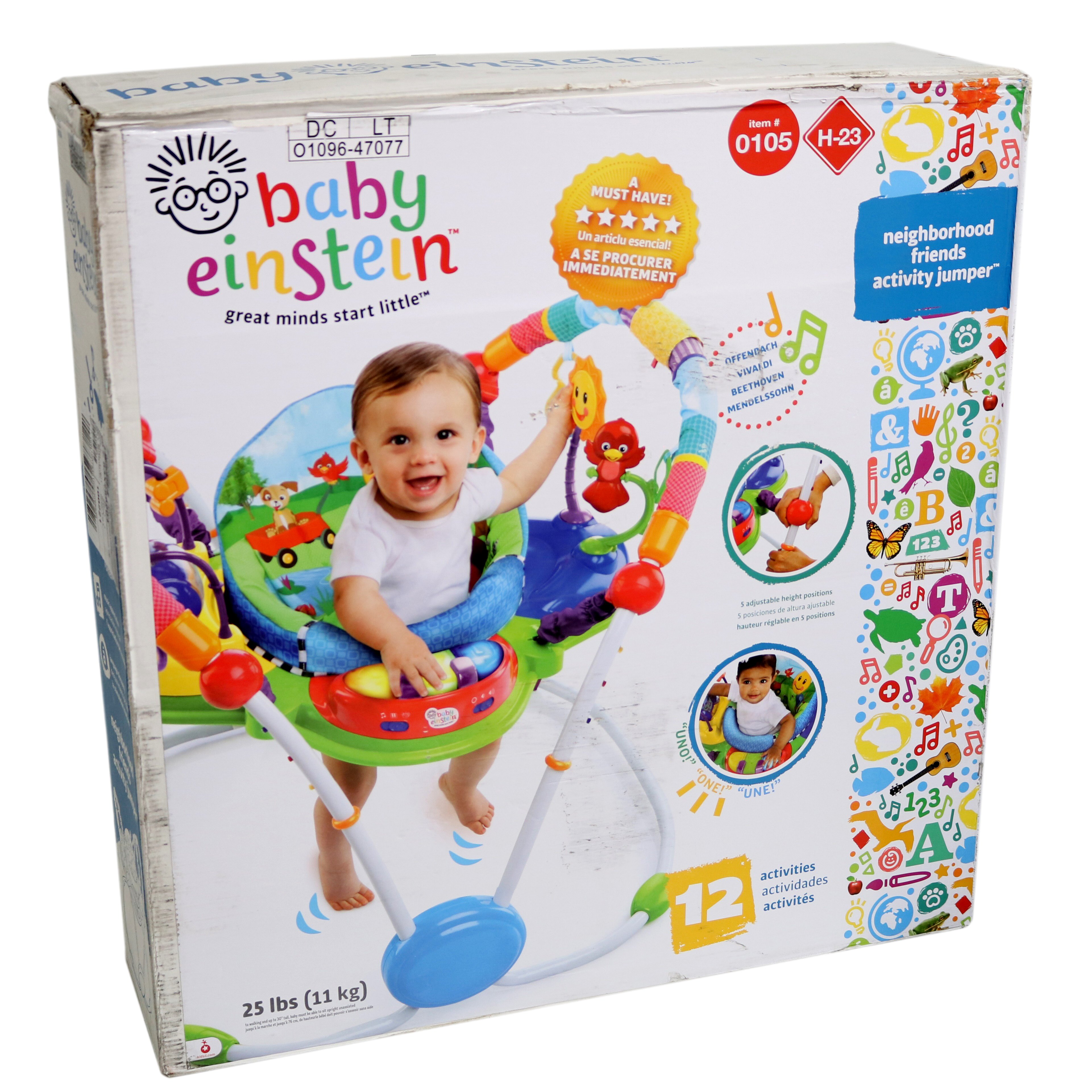 The baby einstein neighborhood friends activity jumper will make your little one jump for joy as they explore 360 of fun multi sensory activities with their favorite baby einstein friends.